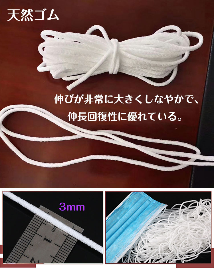幅:およそ3MM*長さ:50メートル(10m×5) 生地 ゴムなど カラー ホワイト 商品説明 スク用ゴム紐 高いストレッチ性と柔らかい肌触りをあわせ持つので、 アクティブシーンや長時間の移動でも圧迫感がなく、ストレスフリーな着心地を持ちます。
