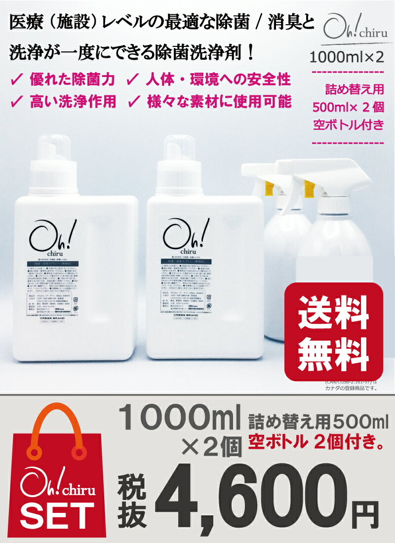 製品仕様商品名Oh!chiru(オーチル)1000ml・2個+(詰め替え用/空スプレーボトル2個・500ml付き) 内容量1000ml×2個商品説明■優れた除菌力・AHP配合(カナダの VIROX 社の独自特許技術により開発された成分) ■高い洗浄作用・カナダ基準委員会CGSB2.16-87 クリーニング効果85%。