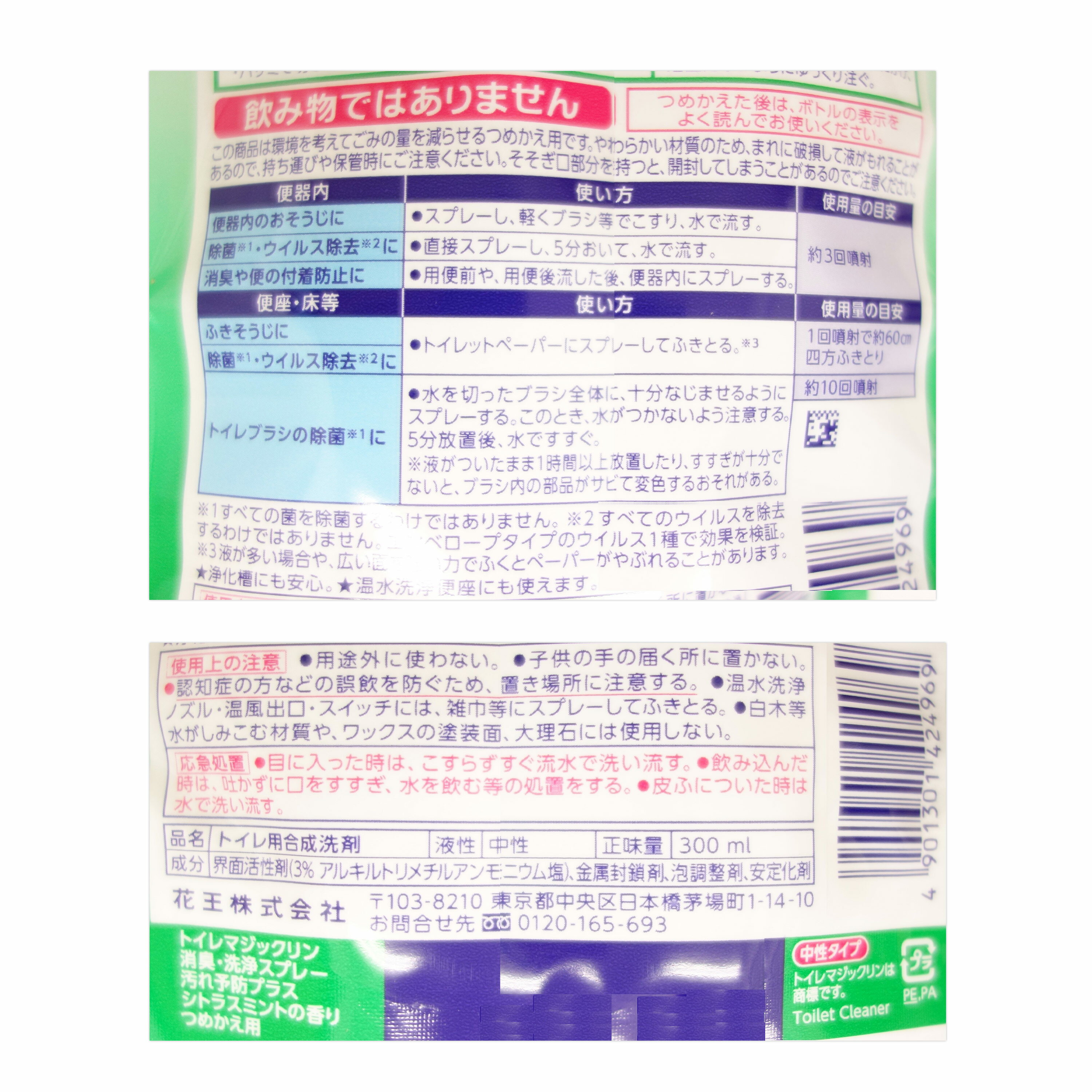トイレマジックリン シトラスミントの香り 詰替 品名: トイレマジックリン ツヤツヤコートプラス シトラスミントの香りつめかえ用 製造: 花王 正味量: 330ml 入数: 24パック ケース番号: 33482 JANコード: 4901301334824 ※メーカー都合により デザイン等が予告なく変更になることがあります。